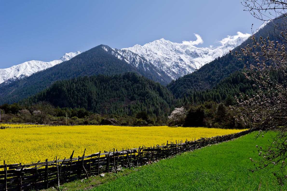 波密位于雅魯藏布江東岸,野桃花每年三月都盛開,漫山遍野桃花綻放,千姿百態(tài),仿佛陶淵明詩中的桃花源。那里被當(dāng)?shù)厝朔Q為“桃花島”。由于交通不便,少為人知,是真正名副其實(shí)的“世外桃源”。四周高聳的雪山包圍著波密的小村莊,大片的桃花、油菜花、青稞把田野染得紅、黃、綠一片。這種韻味獨(dú)特的美,令人欣喜若狂。
