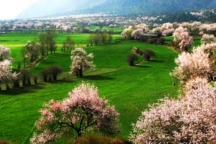 當(dāng)遠(yuǎn)方的雪山還被皚皚白雪覆蓋的時(shí)候,如緋云紅霞般的野桃花早已掛滿枝頭。高大的野桃樹一棵連著一棵讓密密匝匝的桃花簇?fù)碓谝黄?,形成了一片片桃花云。林芝桃樹屬于毛桃類,花朵雖小,卻粉得嬌艷、紅得誘人,雖不如碧桃和降桃的花形大,但密度高,花朵交織在一起,呼啦啦成千上萬鋪向遠(yuǎn)方。