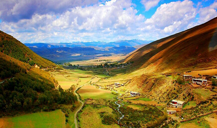 孔雀河谷地帶景色優(yōu)美,四周雪峰峻峭,雪峰下是風(fēng)化的礫石和黃沙形成的堆積層,起伏有序,溝壑縱橫。來自孟加拉灣的海洋季風(fēng)越過喜馬拉雅山吹到這里,形成了青藏高原難得一見的濕潤氣候,大片的綠洲似翡翠般鑲嵌在孔雀河谷,錯落有序的村莊,繚繞的炊煙,趕著牛羊的牧童和轉(zhuǎn)經(jīng)的老人,使人仿佛到了一個(gè)世外桃源,就像傳說中的香格里拉。