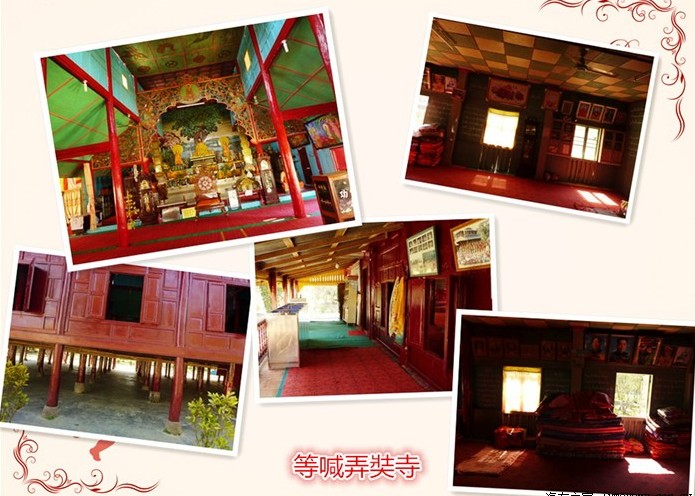等喊弄奘寺,清乾隆年間修建的,傳說(shuō)佛祖?zhèn)鹘?jīng)布道路過(guò)此地住了一夜,信徒為紀(jì)念他而建的。典型的干欄式建筑,曾作為電影《孔雀公主》取景地。