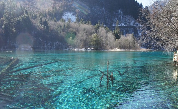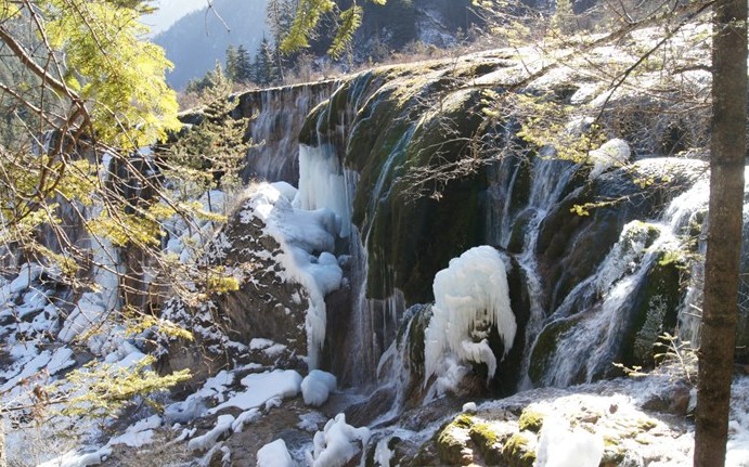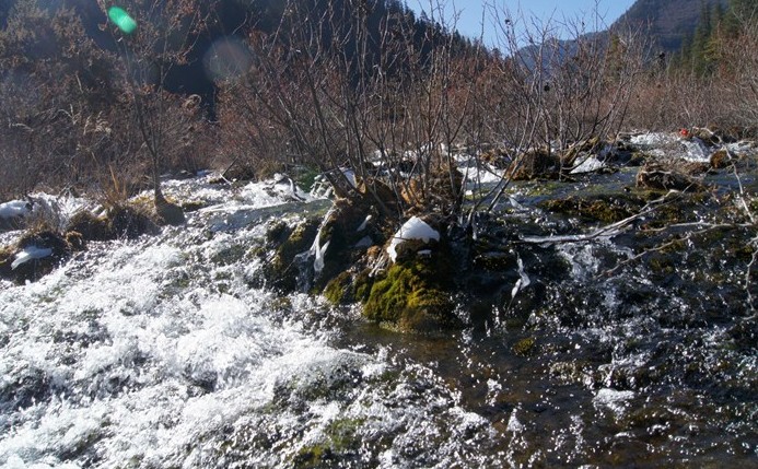 1月18日下午3點從中國的農(nóng)科城出發(fā),一路景色很好。第二天抵達九寨溝口已經(jīng)接近下午4點,雖然有太陽,但是溫度很低。九寨溝現(xiàn)在是淡季,路上行人很少,酒店多數(shù)不開,有上門拉客的酒店人員,第一次進的酒店一晚100,空調(diào)不給力,凍得要命,索性換了酒店,勉強算暖和,外面零下20多度,冷?。√鞖饫涫抢?,卻不無法掩飾九寨溝冬天的美。帽子和手套是必備,到了中午,氣溫上升到10°左右,很暖和。