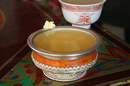 在藏族,酥油茶和糌粑就像漢族的饅頭和稀飯,也像西方的面包和牛奶一樣,形影不離的。酥油茶的主要原料是酥油、牛奶,還可加核桃粉、花生仁、芝麻仁、雞蛋和鹽。酥油茶的制作也很簡(jiǎn)單,將上述原料放入攪拌桶,再將茶水煮至呈紅色后倒入,攪動(dòng)片刻后一桶噴香的酥油茶就制成了。制成的酥油茶必須倒入一把大壺,并放在微火上保溫。按藏家規(guī)矩,飲用酥油茶需用細(xì)瓷小碗,喝茶時(shí)手指不能浸入碗中,而且主人給你倒上的酥油茶最好喝盡,不能留一半在碗底,否則就是對(duì)熱情的主人的不尊重。你不想再喝了,主人決不會(huì)勉強(qiáng),只須將茶碗用手掌蓋住就行了。