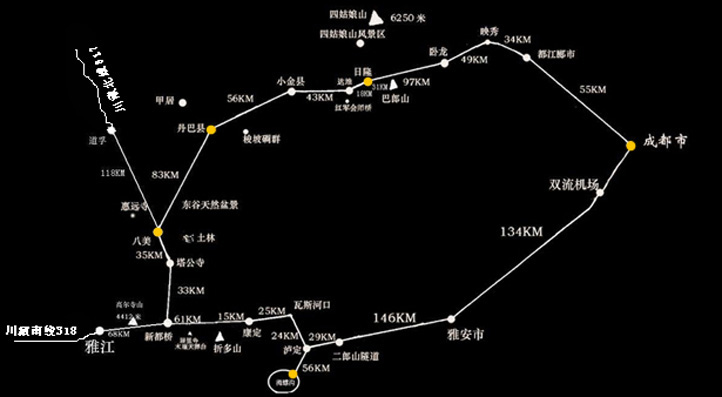成都—丹巴—新都橋—雅江—巴塘—芒康—左貢—八宿—然烏—波密—八一巴松措—拉薩—羊湖—卡若拉冰川—日喀則—珠峰—日喀則—曲水-拉薩—羊八井—納木措—拉薩